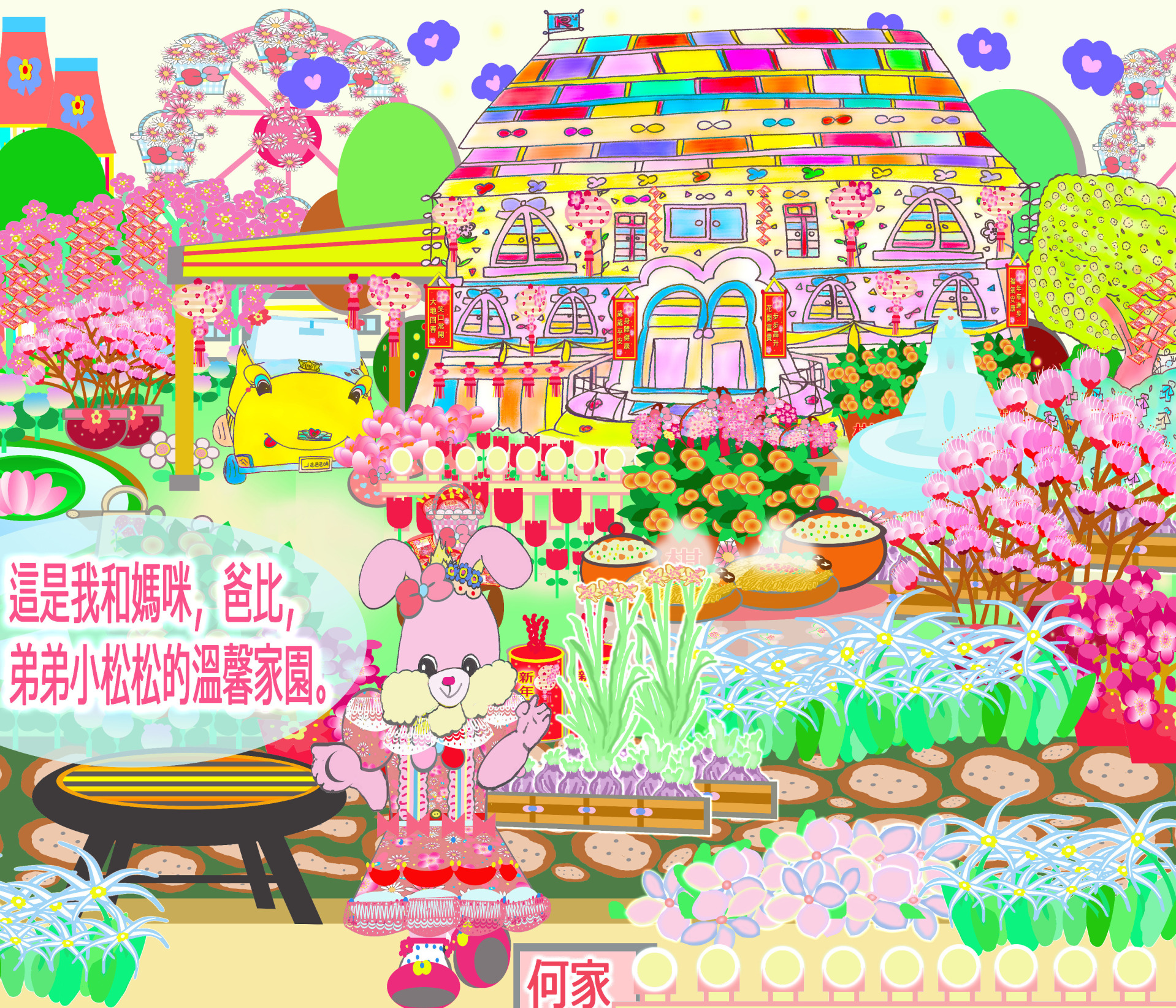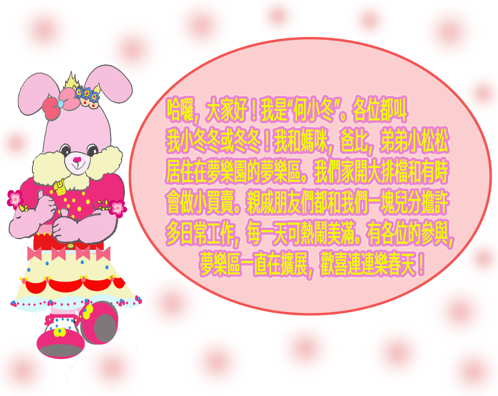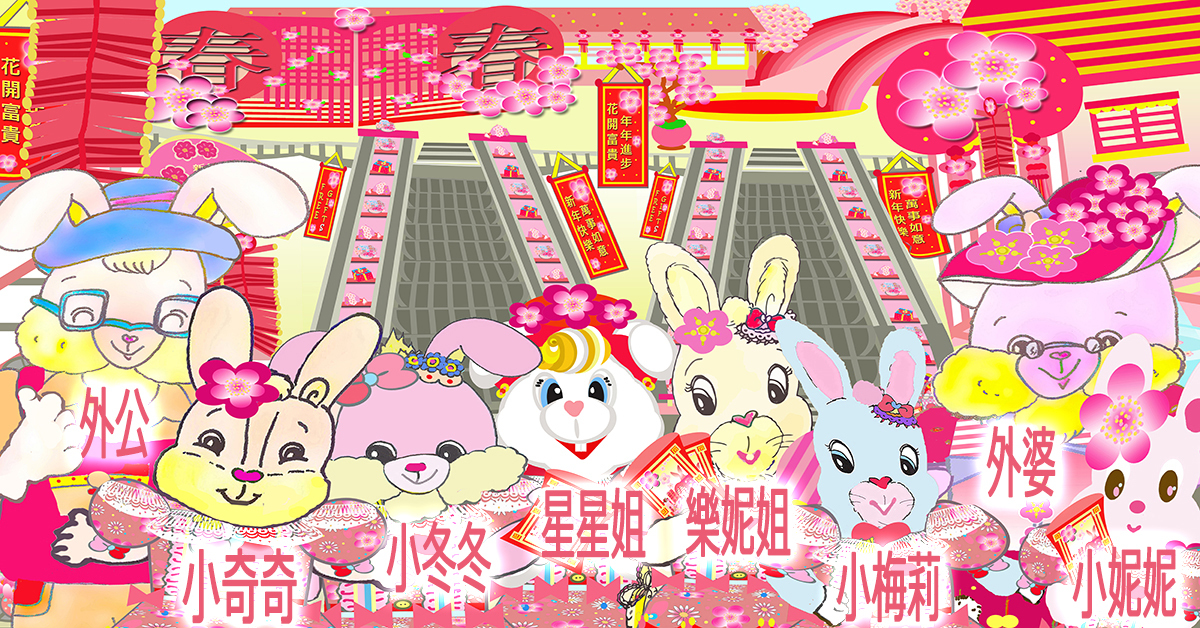 Rolleen, the Pink Rabbit, lives with her family, cousins and friends in the town of Merry Dreamsville in Dreamland. Shortly after finishing her studies, she and Mommy work together to open their Waterfront Food Corner, which now came to be known as the Waterfront Food Centre. It is an open-air eatery which on occasion, also sells garden flowers and fresh veggies brought in from their home. Once in a while, Rolleen also creates and sells little things at her mobile home garden stall. Mommy, whom everyone calls "Auntie Reanne," too owns a tailoring shophouse where she makes custom-ordered dresses, gowns and other outfits for the community. Just last year, Mommy handled the full set of attire for Miss Angel and Mr Tammy's special event at their Waterfront Food Corner. During this Chinese New Year, the now Waterfront Food Centre has an extended wooden deck platform built over the banks by Daddy and relatives to increase the dining floor area, adding to the round-the-clock festive service for everyone. Grandma and Grandpa, who live at a distance in the town of Merry Roseville, are coming over for a full New Year's stay with the family to celebrate a heartwarming occasion during this Year of the Rabbit, so fun and cheer is awaiting all and we have much to expect in the coming days!!!